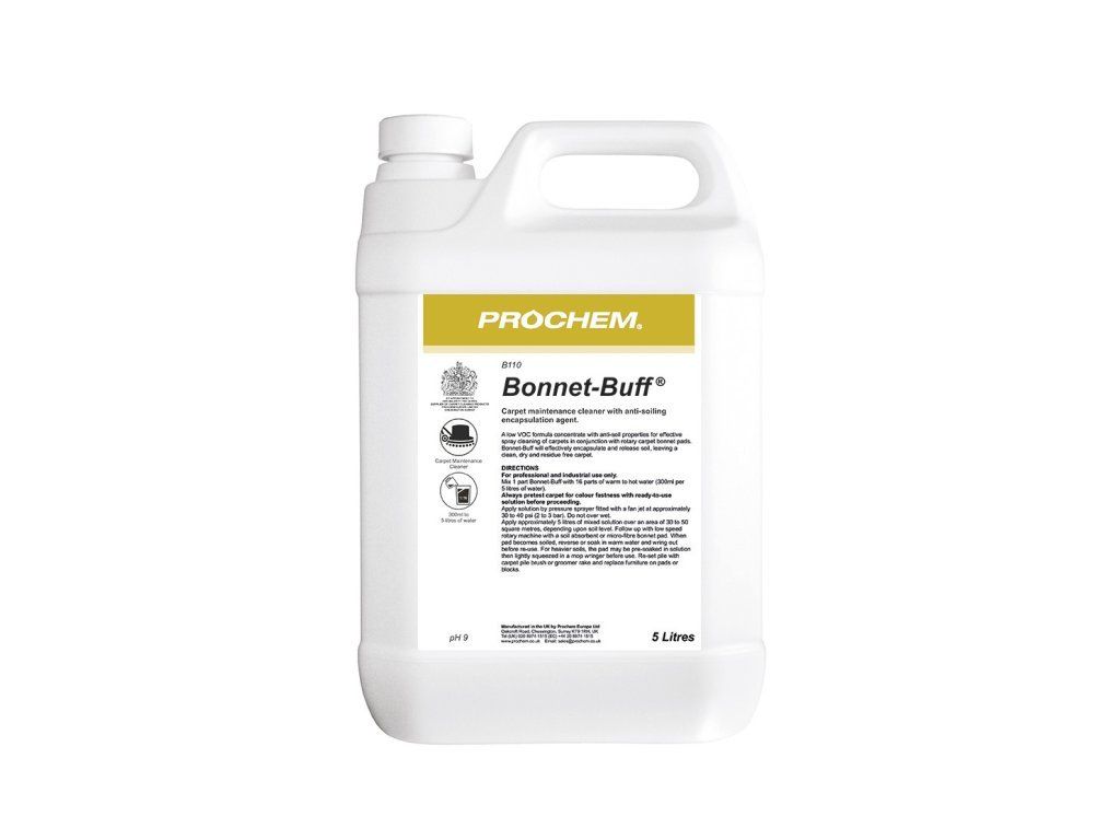 Bonnet-Buff je ideálny na pravidelnú údržbu kobercov s ľahkým až stredným znečistením. Tento číry čistiaci roztok s vôňou citrónu a levandule rýchlo schne a minimalizuje narušenie prevádzky. Vďaka zloženiu so zníženým zvyškom zvyšuje odolnosť kobercov voči opätovnému znečisteniu.