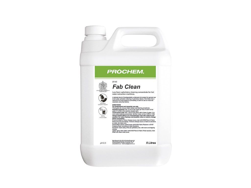 Fab Clean je špeciálne vyvinutý pre čistenie textílií a čalúnenia pomocou horúcovodných extraktorov. Je šetrný k vláknam a farbám, vďaka neutrálnemu pH. Vhodný pre prenosné aj truck-mount zariadenia. Biologicky rozložiteľné zloženie podporuje ekologické čistenie – ideálne pre profesionálne použitie v komerčných priestoroch.